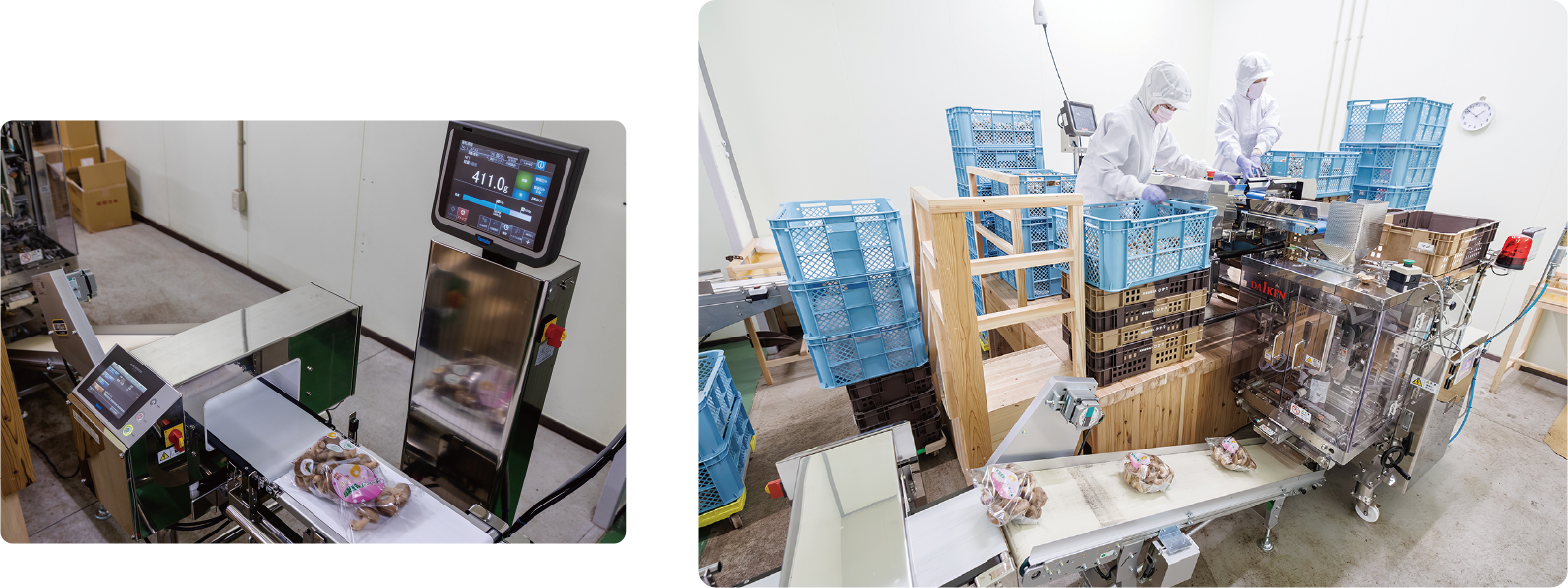 梱包作業には、重さを自動判別しパック詰めする『ピロー』と呼ばれる日本に数台しかない機械を導入しています。