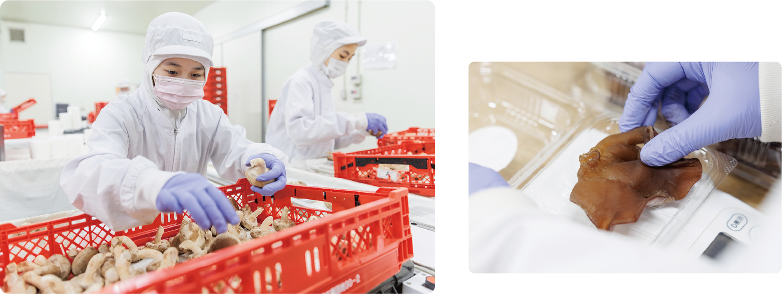 発生した椎茸をサイズごとに分け収穫します。1菌床から複数回の採取が可能ですが、当社では1回取りを原則としています。
